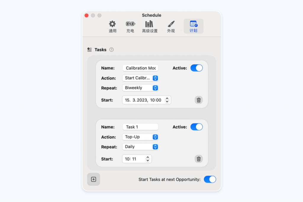 支持精确设定充电开始/结束时间、目标电量百分比及循环计划,可按天或按周期重复执行,便于实现长期电池维护自动化。